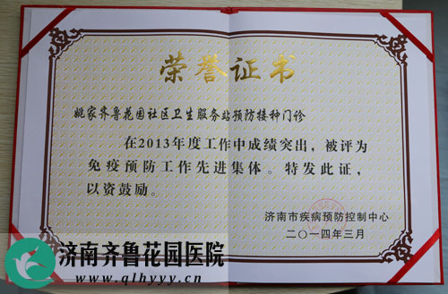 我院预防接种门诊荣获的“济南市群众满意预防接种门诊”称号,是历下区预防接种门诊中唯一荣获该称号的门诊,“2013年度免疫预防工作先进集体”历下区只有两家。这两项荣誉是济南市卫生局领导对我们预防接种工作的高度肯定,也标志着我院预防接种工作上了一个新台阶,是我院计划免疫工作的里程碑。