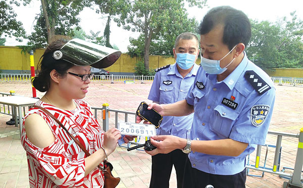2020年8月26日,在市中区交警大队三中队电动自行车挂牌登记点,民警为市民的电动自行车登记挂牌。该挂牌登记点民警介绍,随着距8月31日挂牌登记截止日越来越近,每天前来登记挂牌的电动自行车日均在100辆左右。