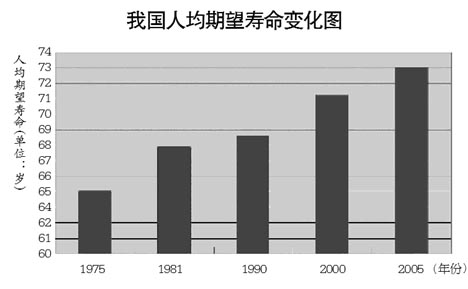 人均期望寿命是衡量一个国家或地区社会经济发展水平及医疗卫生服务水平的指标,也是反映人口死亡率和各年龄别死亡率的综合指标。过去30年间,我国人口期望寿命由1975年的65.0岁增加到1981年的67.9岁、1990年的68.6岁、2000年的71.2岁、2005年的73.0岁。在期望寿命增量中,45.2%归因于60岁及以上老年人,39.6%归因于5岁以下儿童死亡率的下降。