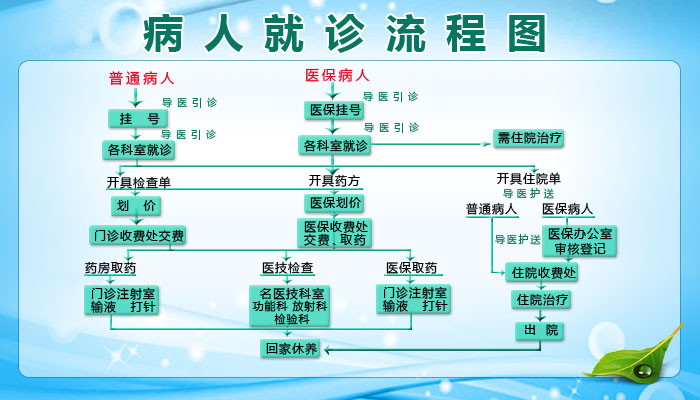 普通病人:(1)初诊患者(初次来医院就诊)导医引导到收费窗口办理“一卡通”并预存费用(2)由导医引诊到相应科室(3)开具检查单、药方或住院单(4)药房取药(5)门诊注射室(输液大厅)输液打针;