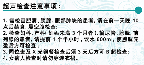 1:需检查胆囊、胰腺、腹部肿块的患者,请在前一天晚10点后禁食,第二天清晨空腹检查;