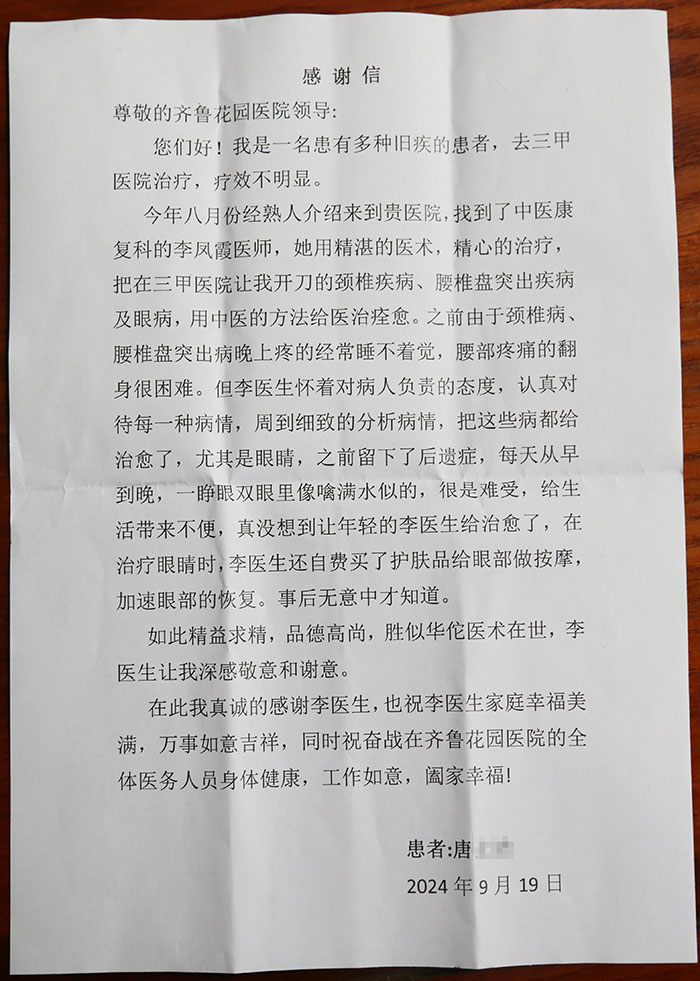在此我真诚的感谢李医生,也祝李医生家庭幸福美满,万事如意吉祥,同时祝奋战在齐鲁花园医院的全体医务人员身体健康,工作如意,阖家幸福!