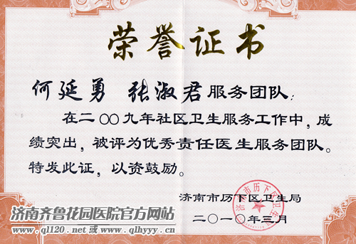 “2009年度历下区卫生系统优秀责任医生服务团队”荣誉证书