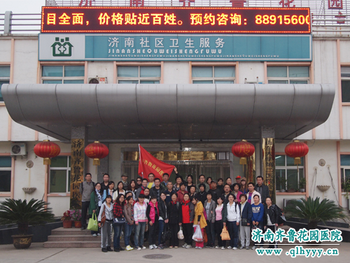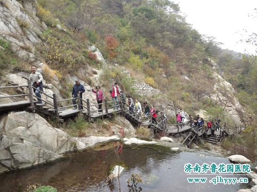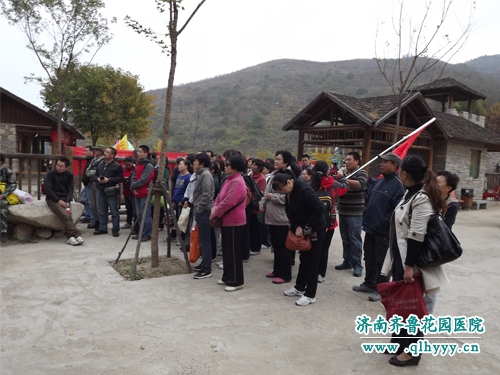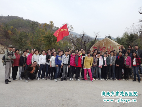 济南齐鲁花园医院职工正认真听导游讲解九如山示意图