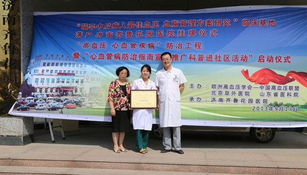 2013年9月17日,济南市花园路1号,齐鲁花园医院门前广场,欧洲高血压学会-中国高血压联盟、北京阜外医院、山东省医科院主导的“脑卒中后病人最佳血压血脂管理方案研究”临床基地落户济南齐鲁花园医院挂牌暨心血管病防治指南宣传推广科普进社区——高血压心脑血管疾病防治工程启动仪式正式拉开帷幕。
