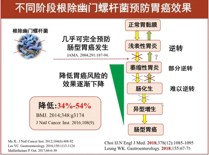 据研究,在我国胃癌高发区胃萎缩、肠化生发生年龄较低,30岁前已有近50%萎缩。而在萎缩、肠化发生前根除Hp更能有效地降低胃癌发生风险。