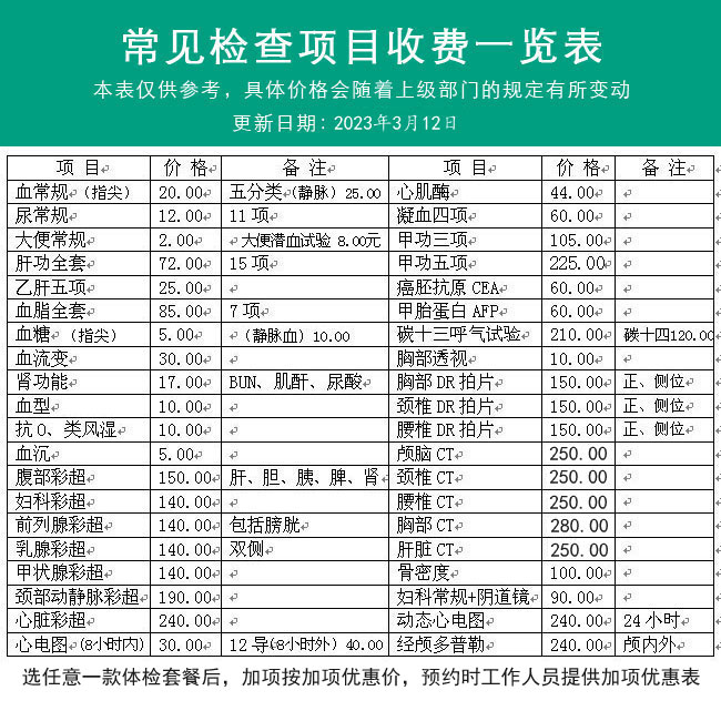 七、单独检查项目收费一览表,选套餐后再加项,享受加项优惠,加项优惠表可要求工作人员提供