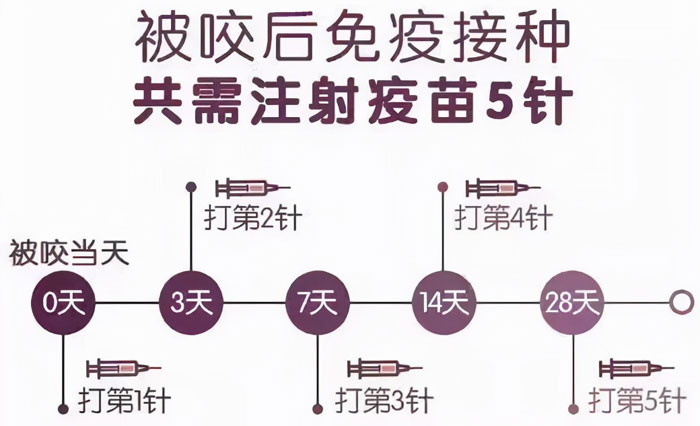 全程免疫接种一年内被狂犬或可疑犬咬伤者,可于0、3天各打一针疫苗。距上次接种已超过一年者,全程接种。