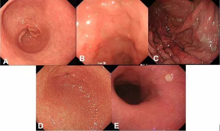 A.萎缩性胃炎;B肠上皮化生;C皱襞肿大;D鸡皮样胃炎;E.黄色瘤