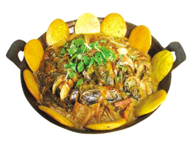 课前指导:原料切成块,腌制后挂全蛋糊。然后将油烧热,用中火炸至金黄色。再放入砂锅中,加入适量汤和调料,烧开后加盖用小火炖七八分钟,最多不可超过十分钟。