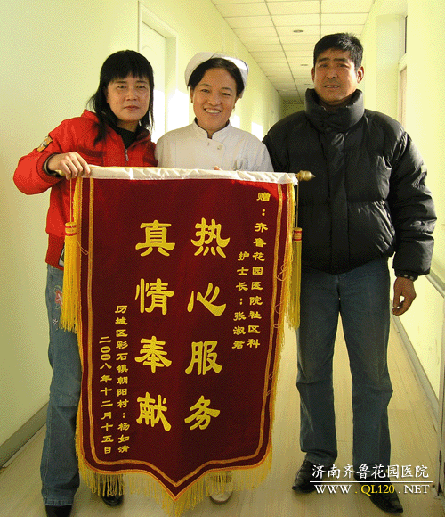 一大早,历城区彩石镇朝阳村的杨如清夫妇就赶到我院,为我院送来“热情服务 真情奉献”锦旗一面,感谢我院张护士长的热情服务。