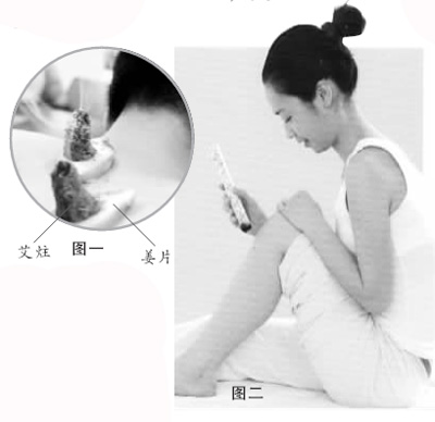 艾炷灸(见图一)的操作是:将厚约0.3厘米的鲜姜片,中间用针穿刺数孔,放在穴位处,将大或中等艾炷放在其上,点燃。待患者有局部灼痛感时,略略提起姜片,或更换艾炷再灸。艾炷多为锥形,每燃尽一个艾炷,称为一壮,一般每次灸5—10壮,以局部潮红为度。