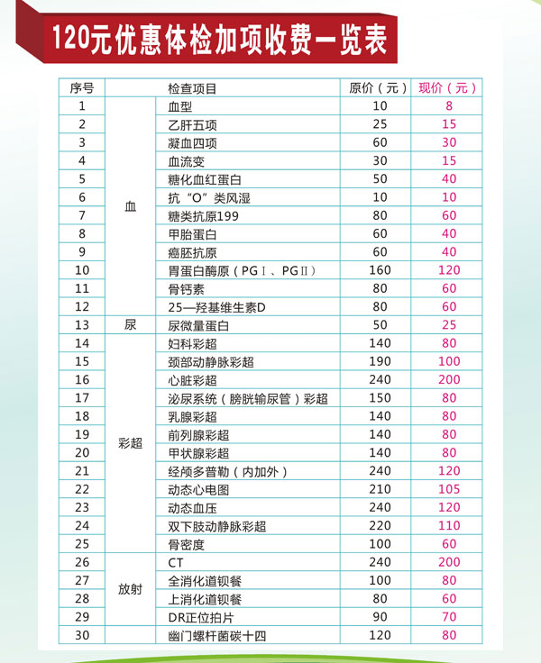 本次优惠特价体检项目含两款优惠套餐:120元优惠套餐和210元优惠套餐(任选)